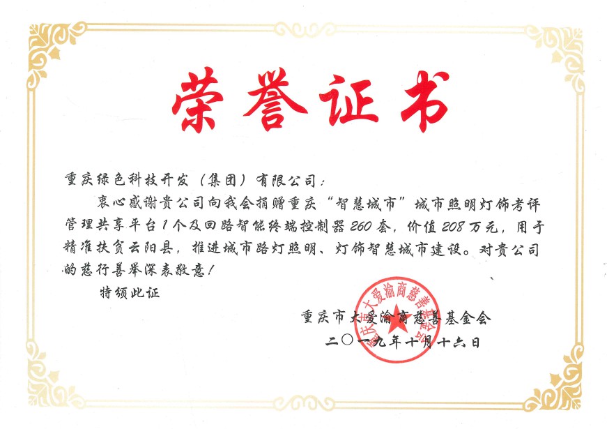10月16日,重慶綠色科技開發(集團)有限公司為支持國家級重點貧困縣精準扶貧工作,積極推進智慧城市建設,通過重慶市大愛渝商慈善基金會,向云陽縣市政設施管理所捐建了回路智能終端控制器260套,以及配套建設重慶“智慧城市”城市照明燈飾四級考評管理共享平臺1個,總價208萬元,用于解決云陽縣城市路燈照明智能化管理的問題,幫助云陽縣實現市政府在《重慶市城市綜合管理提升行動方案》提出的城市照明“一把閘刀”管理的要求。