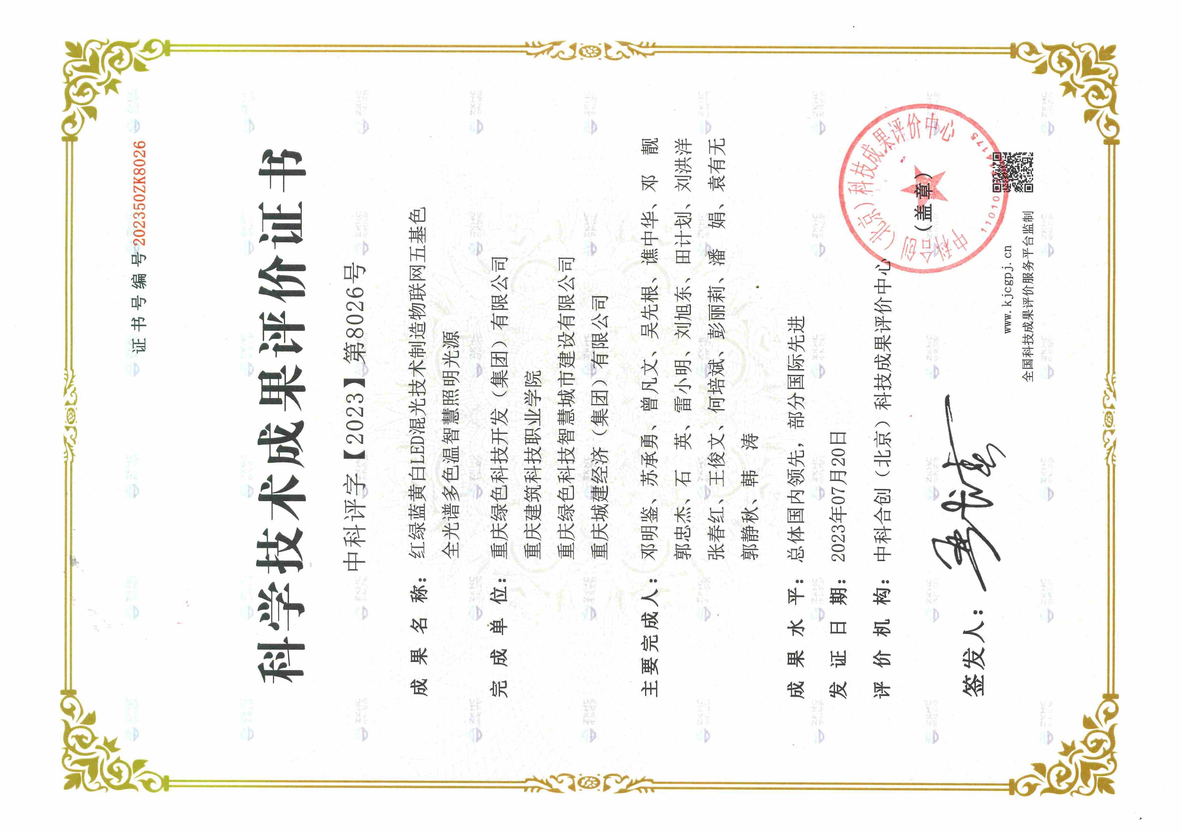 2023711日,中科合創北京科技成果評價中心組織專家,在北京對我司紅綠藍黃白LED混光技術制造物聯網五基色全光譜多色溫智慧照明光源項目進行了科技成果評價。